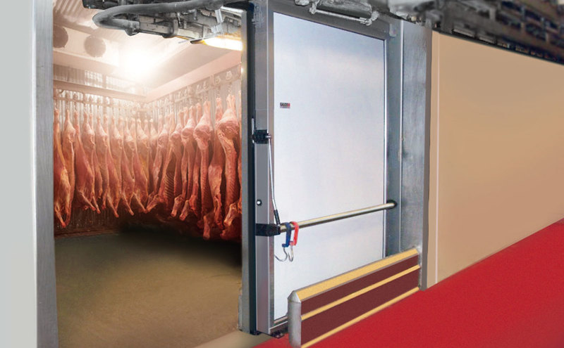 Custom-made for rigorous usage within in-take areas and boning halls of meat processing plants, SALCO’s Meat Rail Doors are available in standard or stainless steel finish and come in varying door thickness to suit the application. The wall and door leaf are completed with thermal breaks to prevent heat bridges, and the doors are equipped with a lowering and lifting rail system. They can be sliding or hinged and the operation can be manual or electrical with variable speed settings.