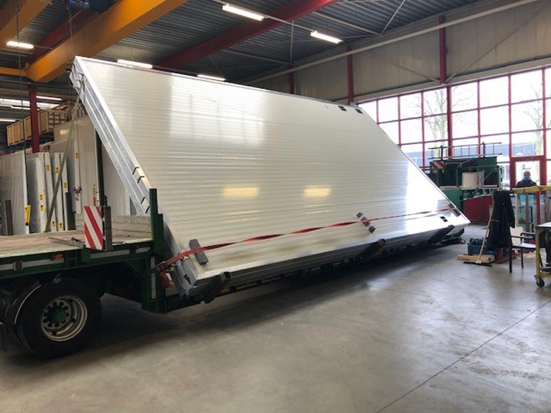 Op de foto zien we weer een 3-tal "grote jongens" van 8 * 4 meter. Ze kunnen maar net op de dieplader maar komen veilig en snel ter plaatse, waarna ze supersnel in het werk kunnen worden geplaatst.