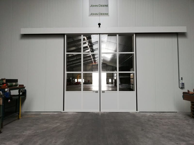 Recentelijk weer een project opgeleverd waarin we een fraai elektrisch bediend schuifdeurstel hebben mogen monteren. Rondom gepoedercoat in RAL 9002, inclusief de kap boven de rails. De voordelen van deze oplossing zijn duidelijk: