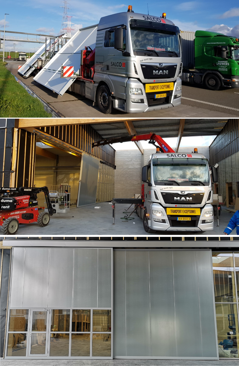 Deze week hebben wij een groot schuifdeurstel voor Brabus Poorten bij Lab15 in Gent mogen plaatsen. Het transport van de deuren was makkelijker gezegd dan gedaan aangezien storm Ciara roet in het eten gooide. Maar dankzij onze transporteur Kees Koopman Transport zijn de deuren veilig aangekomen en ingehangen. Met als resultaat een robuust elektrisch schuifdeurstel van maar liefst 10 bij 5,5 meter groot. De deuren schuiven automatisch voor elkaar langs en zijn uitgevoerd met speciale vlakke panelen en beglazing voor een fraai aanzicht.