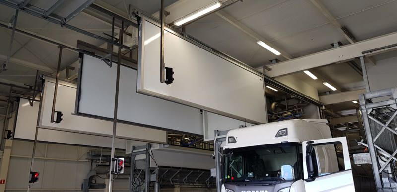 Het betreft hier een 6 tal #koeldeuren van 5940 mm breed en 1920 mm hoog die "zwevend" zijn opgehangen aan een Salco SRA-250 Rails, 6 meter boven de grond. De elektrisch bediende deuren sluiten aan op een bordes op 4 meter hoogte.