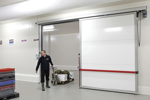 Bouwpakket voor koeldeur. Volledig op maat geproduceerd, EXCLUSIEF blad, geschikt voor een vulling van 100mm sandwich panelen. Rondom afgewerkt met geanodiseerde aluminium profielen, koudebrugvrij. Uitgevoerd met een aluminium val/hef-railsysteem.